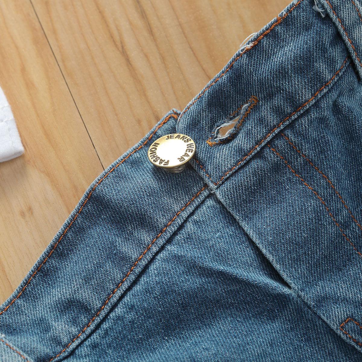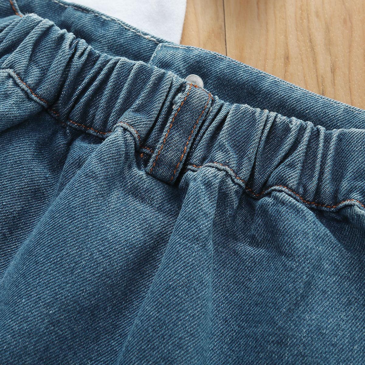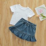 Offrez un look quotidien amusant et décontracté grâce à cet ensemble adorable, associant un tee-shirt blanc doux et une mini-jupe en denim chic.